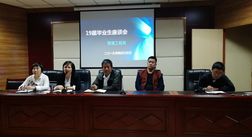 2019年4月25日星期四晚上19:00,我系在行政楼509会议室举行2019届毕业生座谈会。会议由李茂英老师主持,系部副主任高彩琴、刘小毛老师、杨金玲老师出席,本次座谈会特邀教务处处长杜芳兴、招就处就业处干事陈志文老师出席此次座谈会。