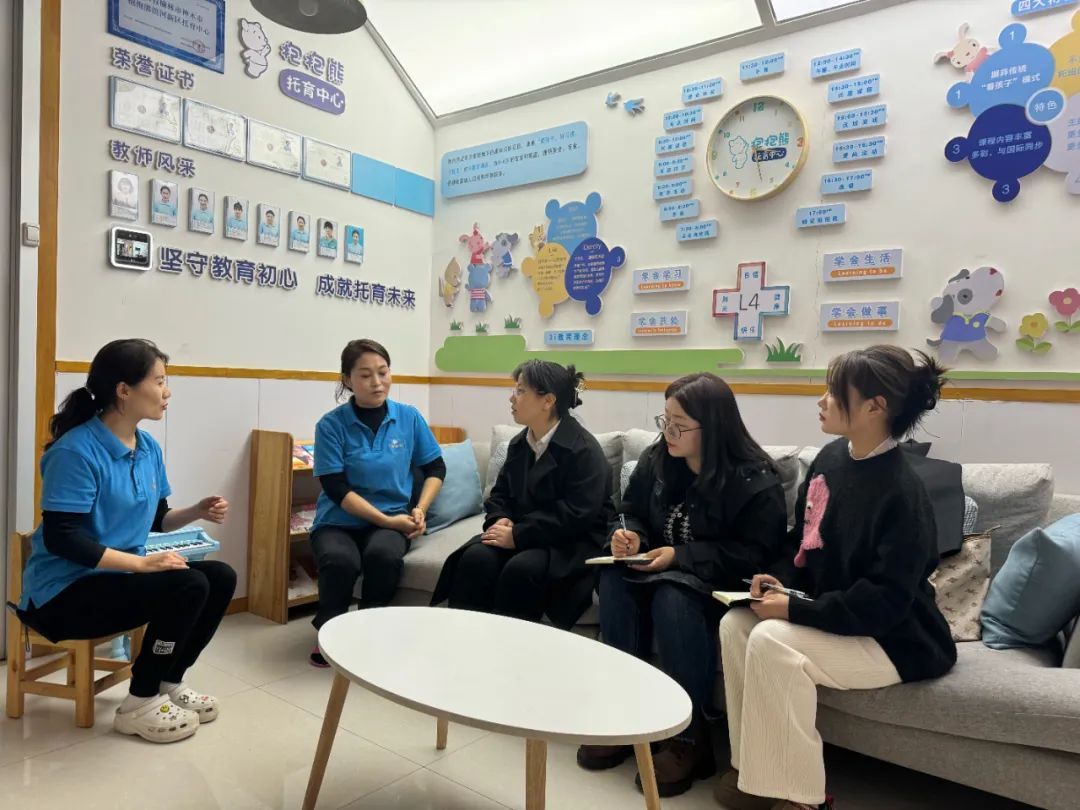 在东方爱婴·抱抱熊托育中心,调研组参观了园所环境,了解托育机构基本情况,重点围绕托育机构课程体系、职业岗位要求、专业能力,探讨婴幼儿托育服务与管理专业人才培养方面的问题及方向。