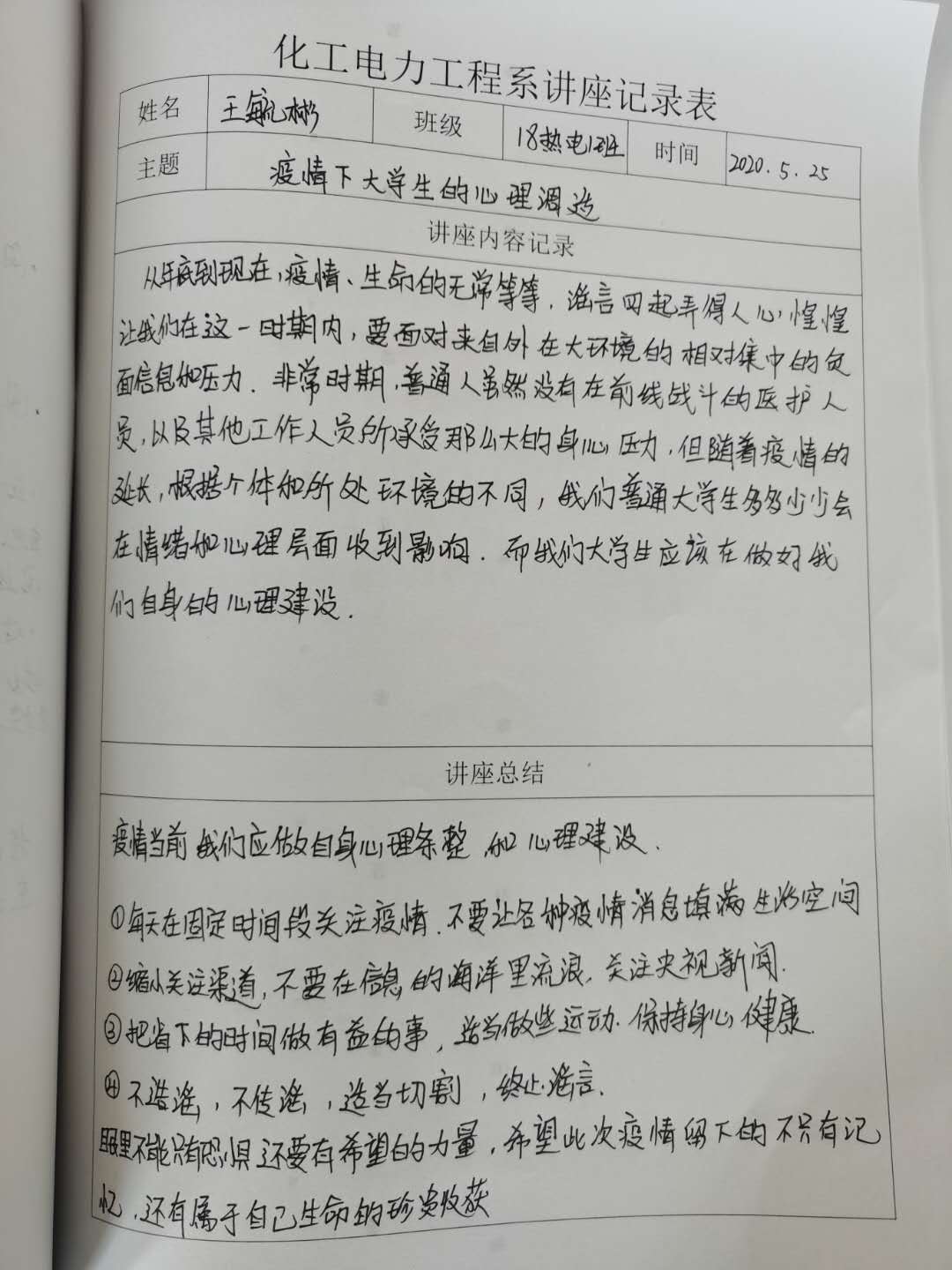 通过讲座学习,有学生表示“虽然我们无法成为逆行者奔赴前线,尽自己所能过好自己的生活也是一种担当”。