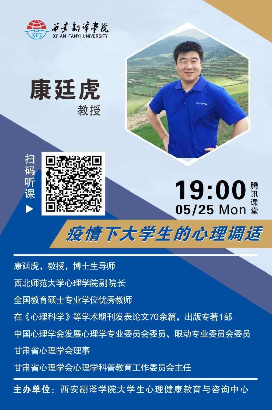 2020年5月25日是一年一度的525(吾爱吾 I love me)大学生心理节,今年的活动主题是“共抗疫情显担当、守望相助心成长”。当晚,我院心理服务中心组织各系学生听取了西北师范大学博士生导师——康廷虎教授的“疫情下大学生的心理调适”线上讲座。