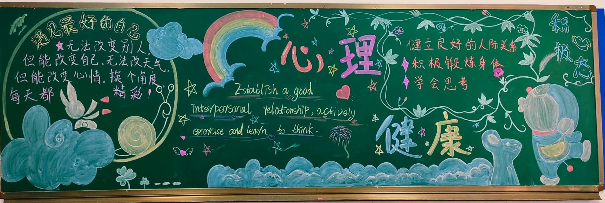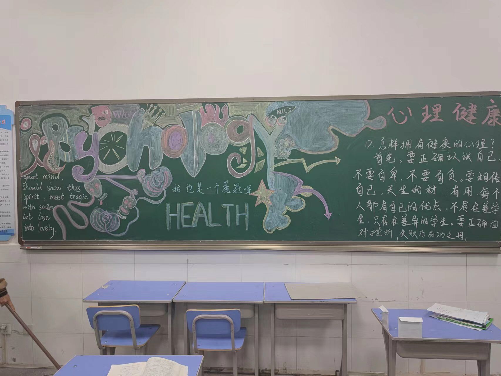 黑板报是校内知识宣传的重要媒介,利用心理健康主题黑板报,可以让出黑板报的同学有心理知识的收获和绘画能力的提高。同时每班黑板报在出版的时候也会根据本班的实际情况调整内容,这让每班的黑板报更加有特色,也更加的符合每班学生心理健康发展需要。