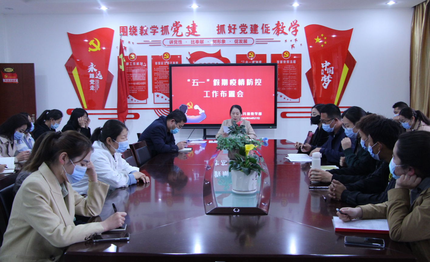4月27日,公共课教学部召开五一期间疫情防控工作部署会,传达学院疫情防控工作会议精神,对全系部五一假期疫情防控工作进行再安排、再部署。系部主任贾晓霞主持会议并讲话,系部所有专兼职教师参加会议。