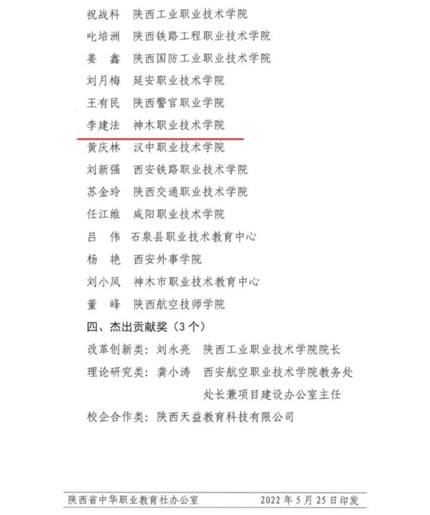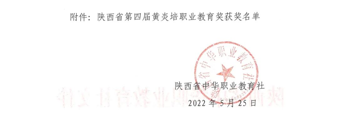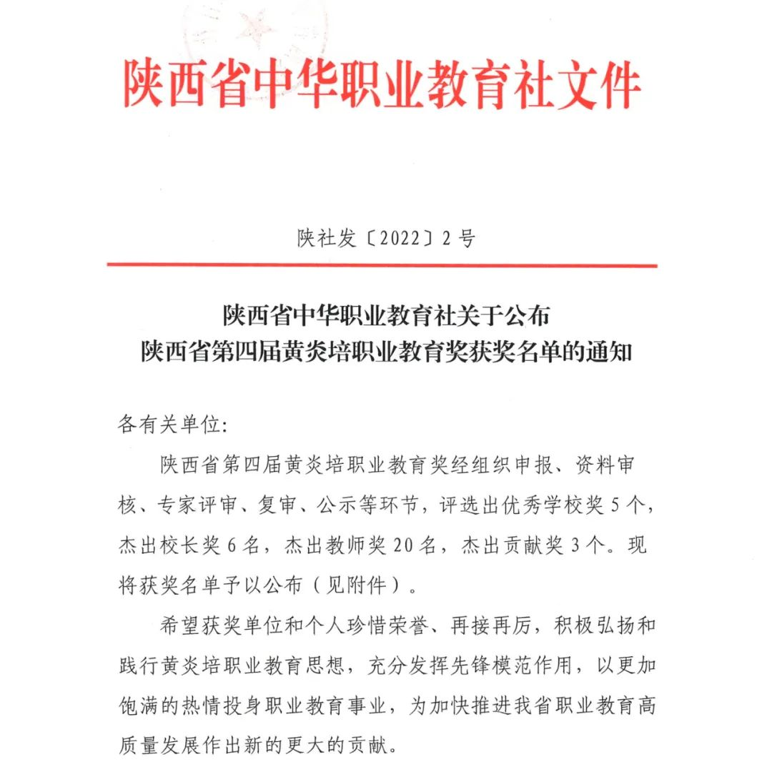 近日,由陕西省中华职业教育社组织的“陕西省第四届黄炎培职业教育奖”评选活动圆满结束,经组织申报、资料初审、评审委员会评审、评审工作领导小组终审、公示等环节,共评选出优秀学校奖5项、杰出校长奖6项、杰出教师奖20项、杰出贡献奖3项。