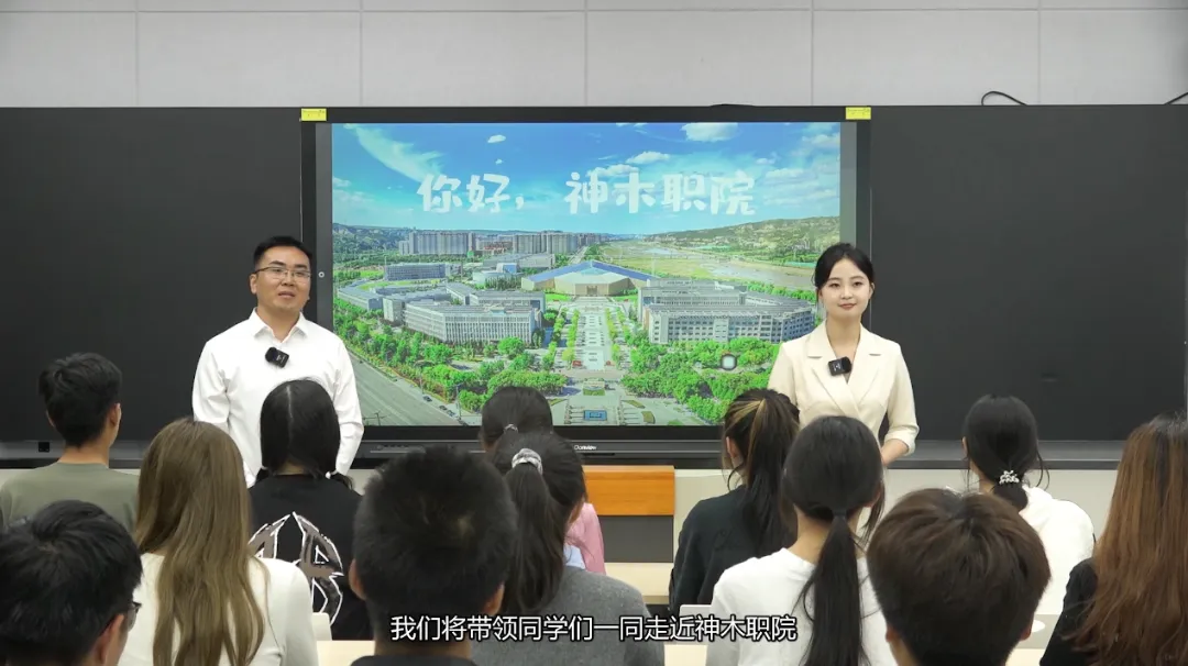 课堂分为三部分,第一部分“你好,神奇神木”,从经济、社会、自然、文化等方面展示了神奇神木,为新同学们描绘出了神木的神秘神往。第二部分 “你好,神木职院”是课堂的核心部分,由公共课教学部王慧老师和思政部杨思勤老师担任主持人,带领大家认识神木职院、了解神木职院、爱上神木职院。