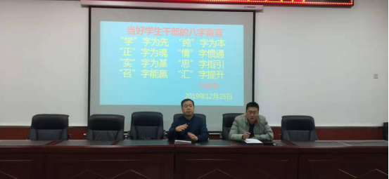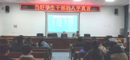 1. “学”字为先;2.“纯”字为本;3.“正”字为魂;4.“情”字贯通;5.“实”字为基;6.“思”字指引;7.“召”字能赢;8.“汇”字提升。当好学生干部不仅可以提升和发展自我、树立正确的价值观,还可以为班集体做出应有的贡献。希望各位同学们能够认真踏实地对待每一份工作。