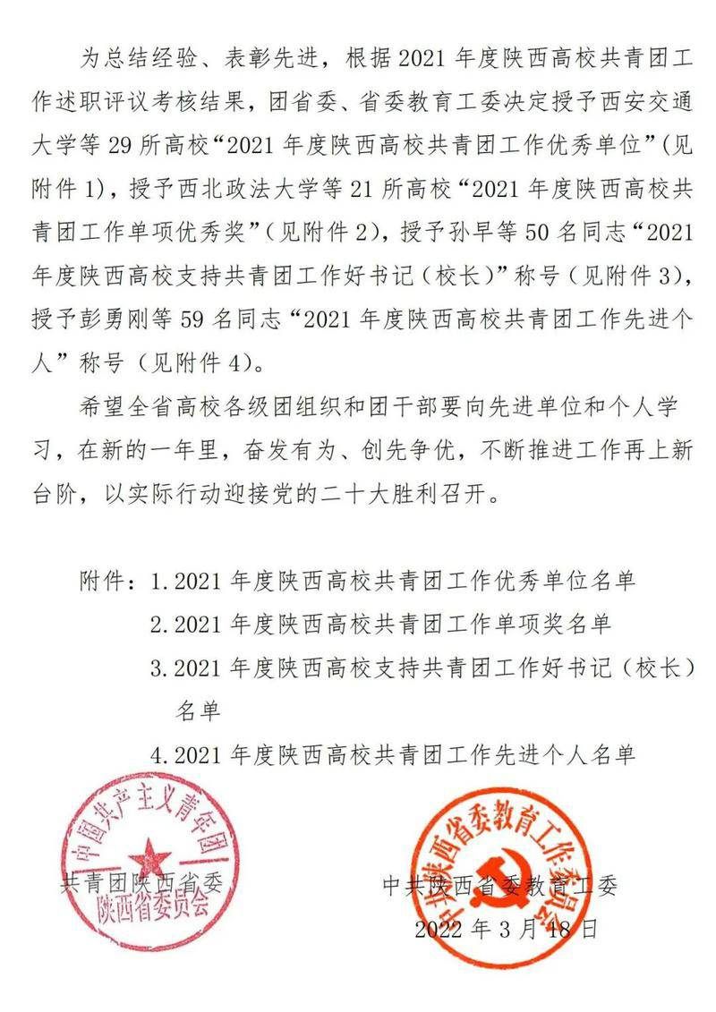 近日,共青团陕西省委印发了《关于2021年度陕西高校共青团述职评议考核结果的通报》,365上市公司官网获“2021年度陕西高校共青团工作优秀单位”,校党委书记、校长艾国获“2021年度陕西高校支持共青团好书记(校长)”。