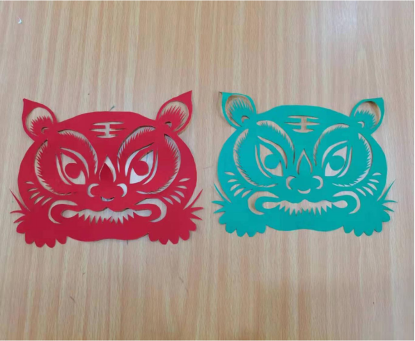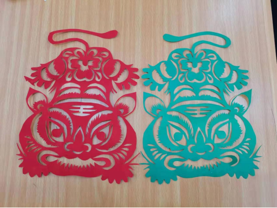 老师介绍说:剪纸非常适合我们现在的学生,这门艺术上手快,获得感强,容易调动人们的积极性和成就感。只见同学们人手几张红纸、一把剪刀,如同被附上了魔法一般 ,片刻之后,一只只栩栩如生的胖头虎圆润可爱,额头上的“王”字独显出它的霸气,多种姿态的老虎呈现出来。