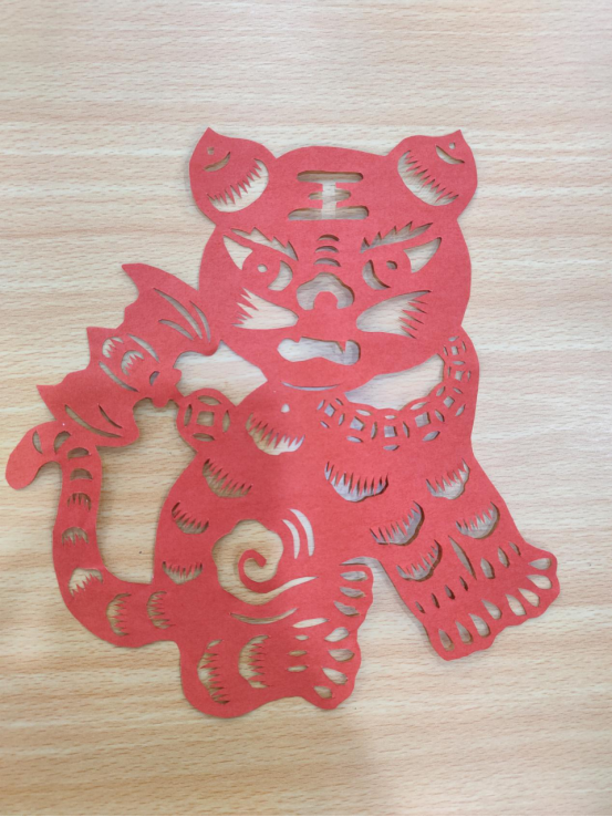 今天剪的是老虎,为了给剪纸活动的学习奠定一个好的基础,老师则讲了老虎的特征,选择老虎作为剪纸,不仅仅是因为虎本身具有一种独特的力量美感,同时因为虎及其凶猛,人们利用这种虎的不惧鬼神的凶猛起到辟邪的作用。