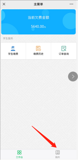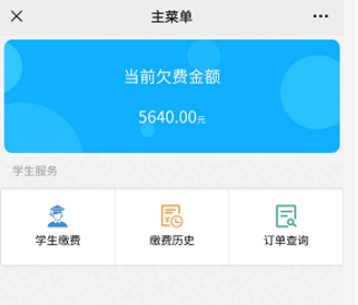 4、登录进入首页,显示欠费金额,同时有三个菜单可以选择,【学生缴费】、【缴费历史】、【订单查询】,如下图所示: