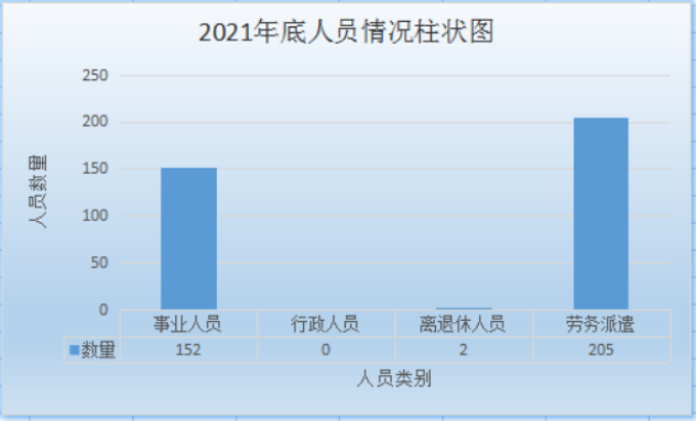 截止2021年底,本部门人员共计359人,人员编制152人,其中行政编制0人、事业编制152人;实有人员152人,其中行政人员0人、事业人员152人;单位管理的离退休人员2人,劳务派遣人员205人。