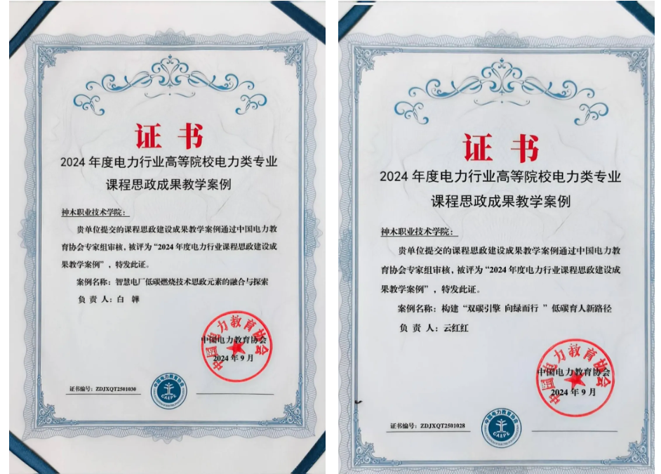 在电力行业高等院校电力类专业课程思政成果教学案例评选中,神木职院白韡老师撰写的《智慧电厂低碳燃烧技术思政元素的融合与探索》与云红红老师撰写的《构建“双碳引擎 向绿而行”低碳育人新路径》案例,凭借鲜明的专业特色与突出的育人价值,从众多参评作品中脱颖而出,双双入选优秀案例库。