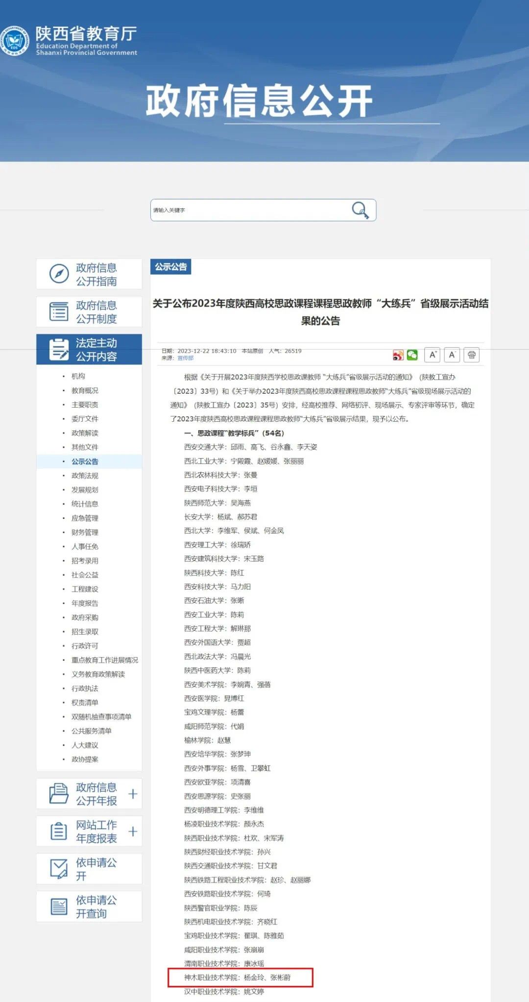 神木职院杨金玲 张彬蔚获2023年陕西高校思政课程“教学标兵”