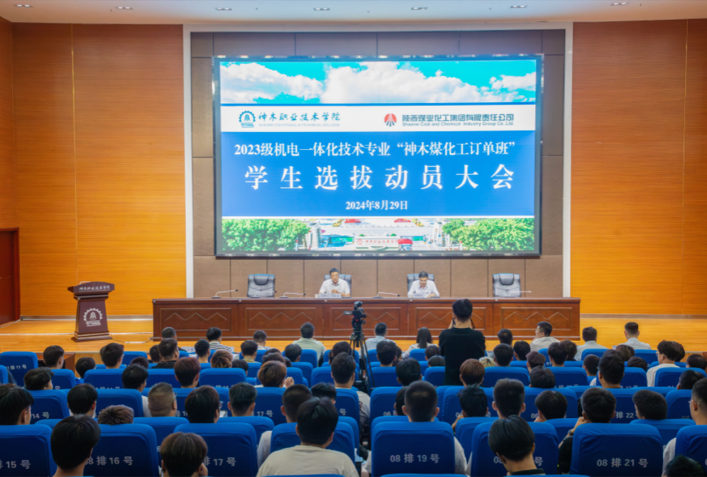 8月29日,2023级机电一体化技术专业“神木煤化工订单班”学生选拔动员大会在图书馆二楼报告厅举行,会议由党委副书记李长春主持,神木煤化工产业有限公司副总经理问绪忠、副总工程师苏怀强、工程技术服务分公司经理王志忠、人事企管部副经理白文霞、人事企管部业务主管任旺、学校相关部门负责人出席,全体申报订单班的23级机电一体化技术专业学生参会。
