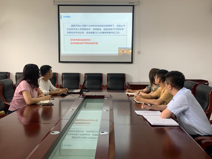 会议伊始,全体人员参加了国开期末考试工作视频会议,会议主要从学期总结、期末考试工作部署及下一步工作计划等三个方面进行,指出各个站点工作亮点及存在的问题,强调“诚信考试,纪律严明”以及秋季的工作计划,鼓励各站点做好学期收尾工作和秋季的招生工作,进一步扩大国开的社会影响力、社会知名度。