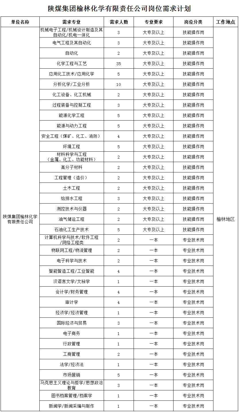 陕煤集团榆林化学有限责任公司招聘信息