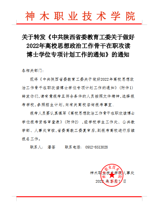 关于转发《中共陕西省委教育工委关于做好 2022年高校思想政治工作骨干在职攻读 博士学位专项计划工作的通知》的通知