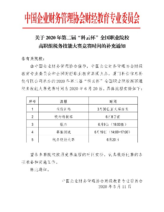 关于2020年第二届“科云杯”全国职业院校高职组税务技能大赛竞赛时间的补充通知