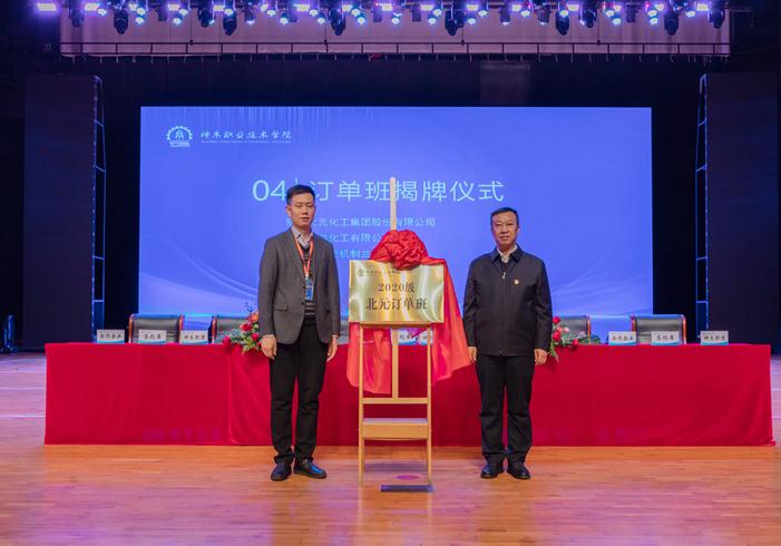 学院领导分别与陕西北元化工集团股份有限公司副总经理王卫明、陕西精益化工集团有限公司监事会主席王平、神木市祥荣机制兰炭有限公司总经理刘胜利共同为校企合作订单班揭牌。