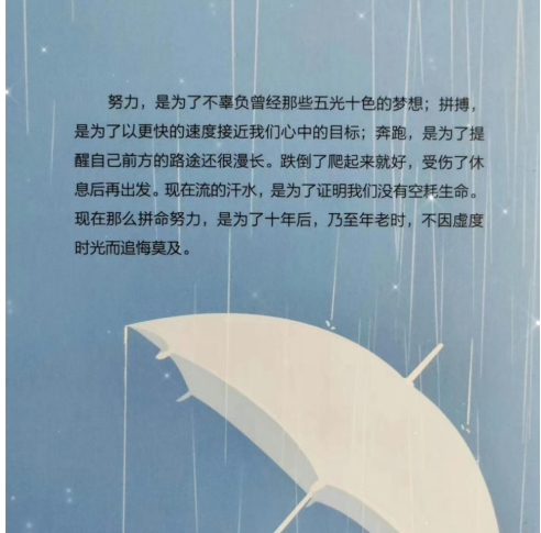 努力,是为了不辜负曾经那些五光十色的梦想;拼搏,是为了以更快的速度接近我们心中的目标;奔跑,是为了提醒自己前方的路途还很漫长。跌倒了爬起来就好,受伤了休息再出发。现在流的汗水,是为了证明我们没有空耗生命。现在那么拼命努力,是为了十年后,乃至年老时,不因虚度时光而追悔莫及。(来源:路国芳)