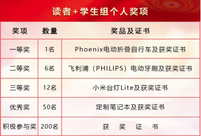“读者+学生”组,竞赛成绩第1名获得一等奖,第2-7名获得二等奖,第8-19名获得三等奖,第20-69名获得优秀奖,第70-269名获得积极参与奖。