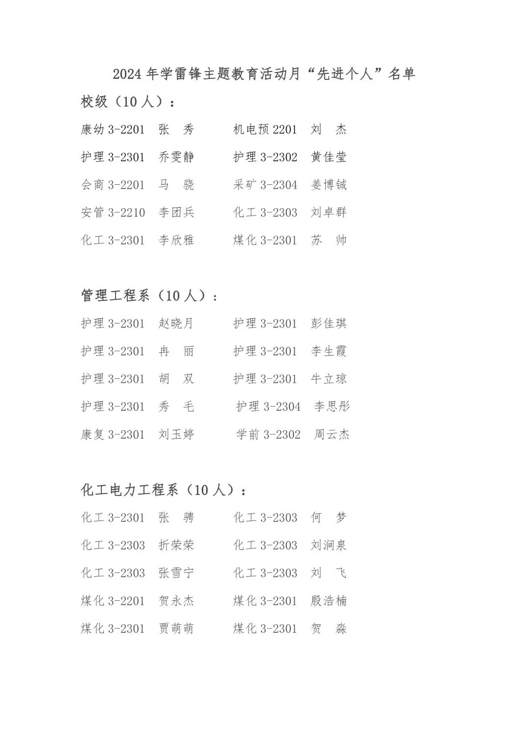 公示 2024年学雷锋主题教育活动月“先进个人”名单