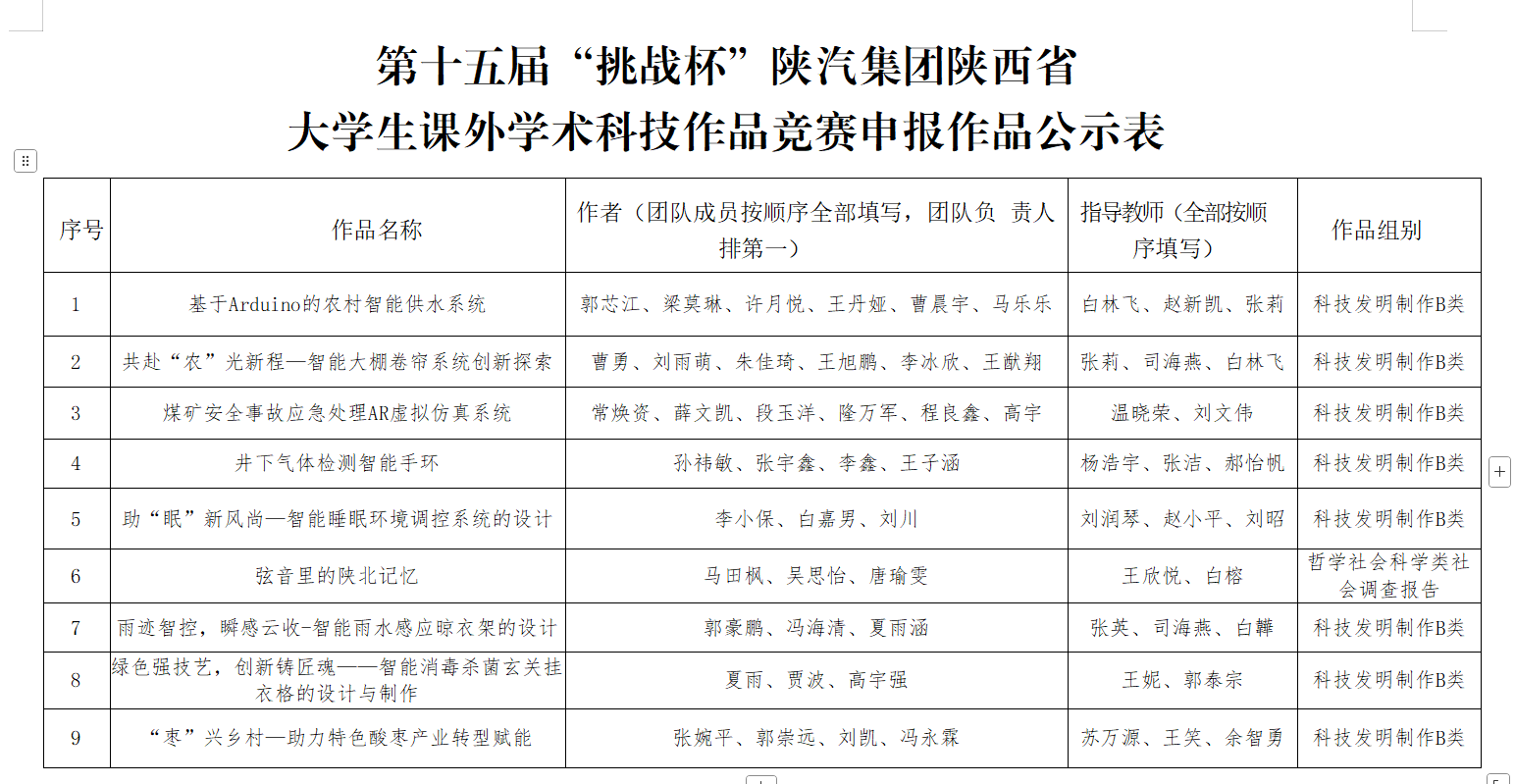 根据团陕西省委举办第十五届“挑战杯”陕汽集团陕西省大学生课外学术科技作品竞赛的文件精神,现将我校参加本次竞赛的作品予以公示,公示期为2025年4月18日-2025年4月24日。如有异议,请以书面材料的形式反馈到团委办公室。