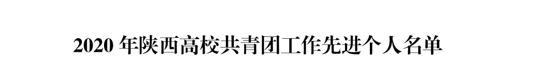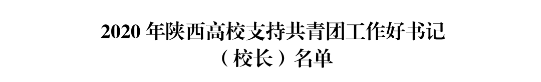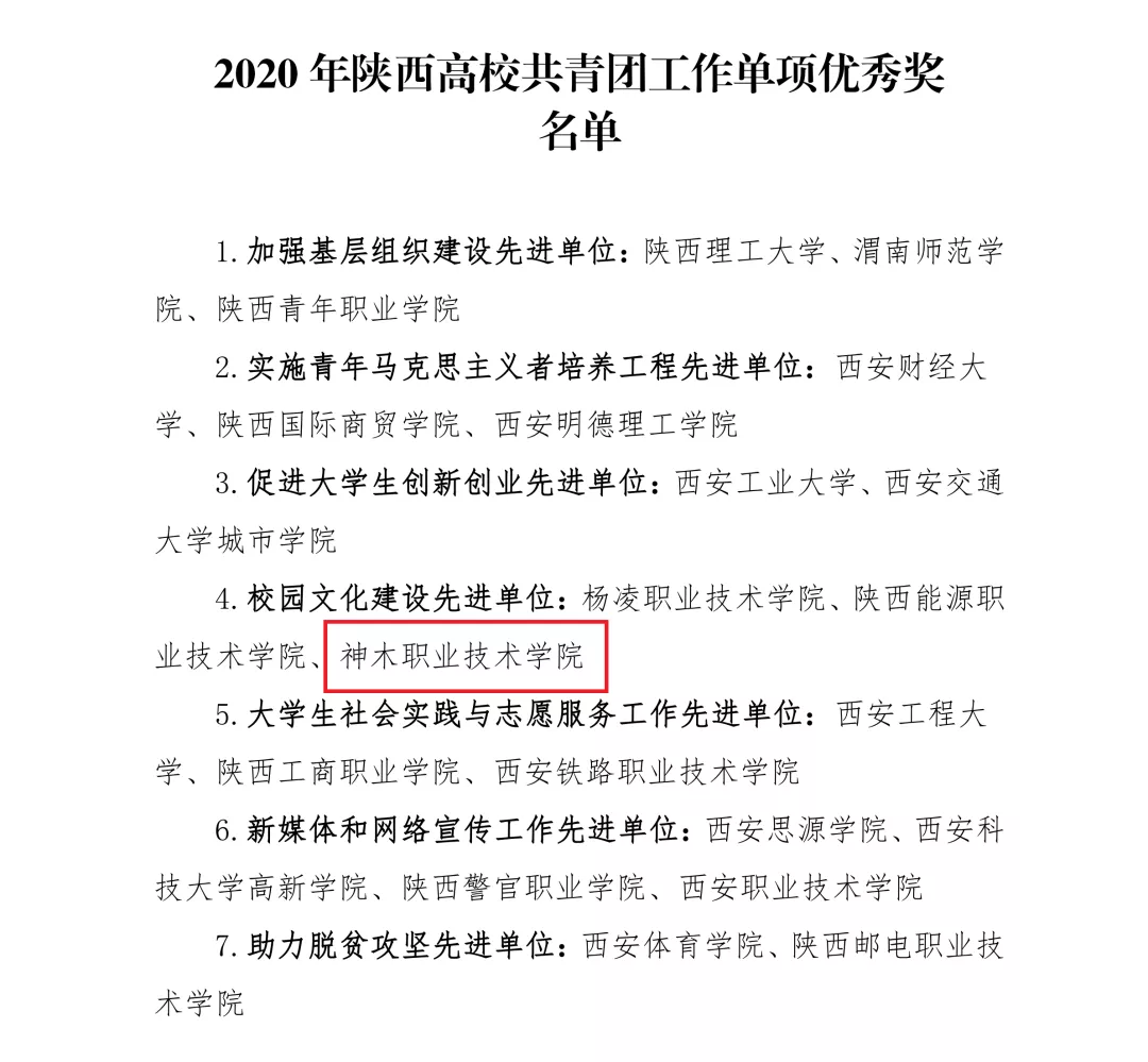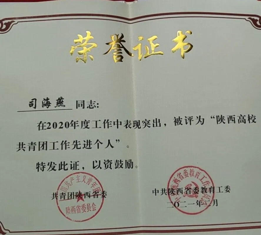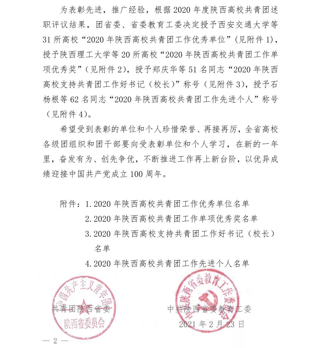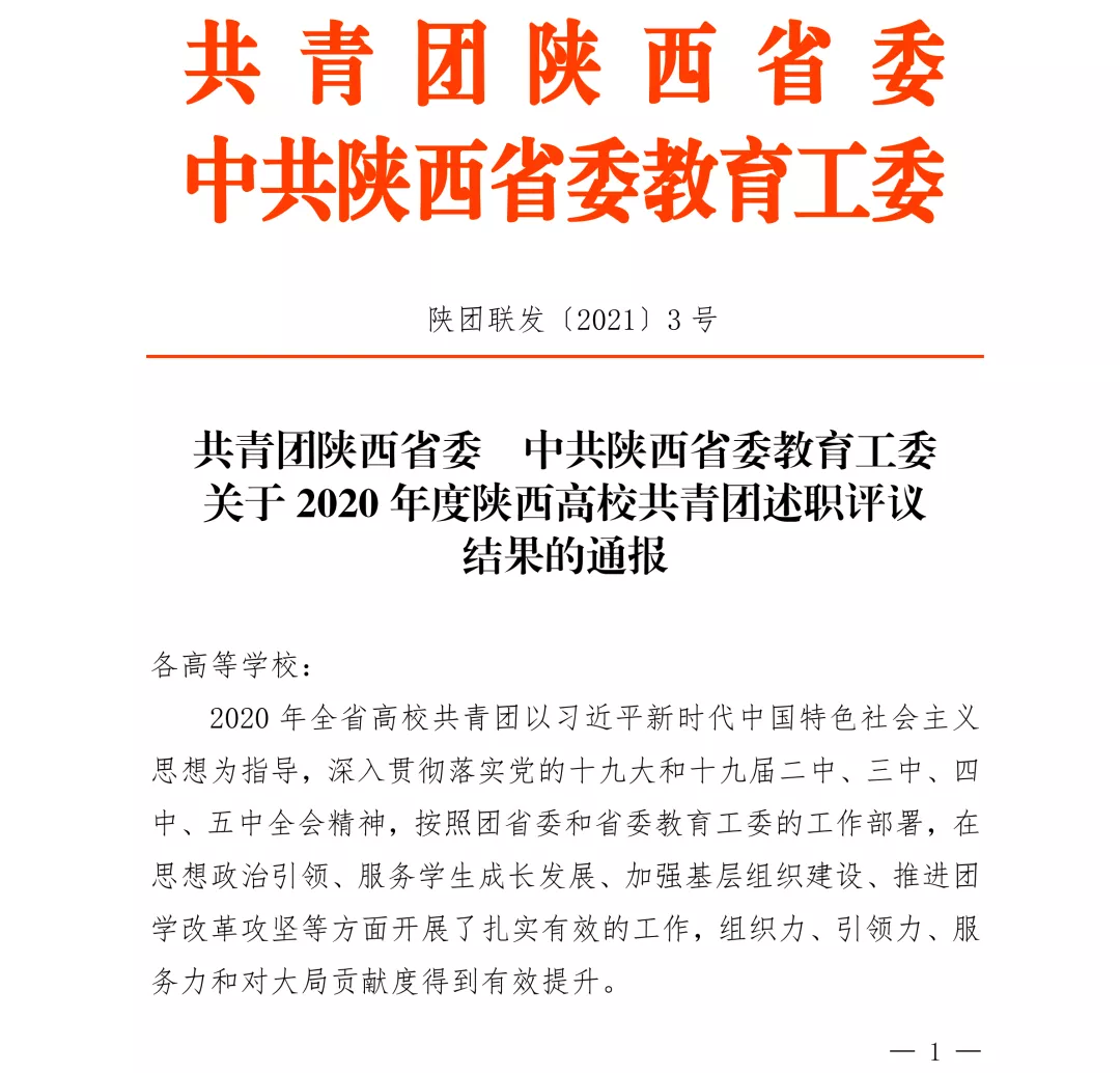 近日,团省委、省委教育工委联合公布了《2020 年度陕西高校共青团述职评议结果通报》,365上市公司官网荣获“2020年陕西高校共青团工作校园文化建设先进单位”奖;党委书记、校长艾国被授予“2020 年陕西高校支持共青团工作好书记”称号;团委书记司海燕荣获“2020 年陕西高校共青团工作先进个人”。