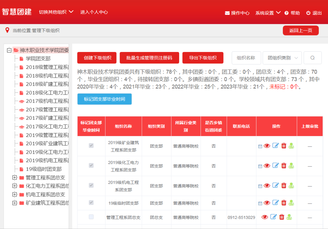 智慧团建:据智慧团建后台统计,365上市公司官网团委共有团员753人,团干部52人;校团委下设18个团组织,并创建了四个团总支,分别为管理工程系团总支、矿业建筑工程系团总支、机电工程系团总支、化工电力工程系团总支,在各团总支下创建了相应的团支部(即各系各级各班团支部);本年度“学社衔接”率、“升学衔接”率、转出完成率均达100%。