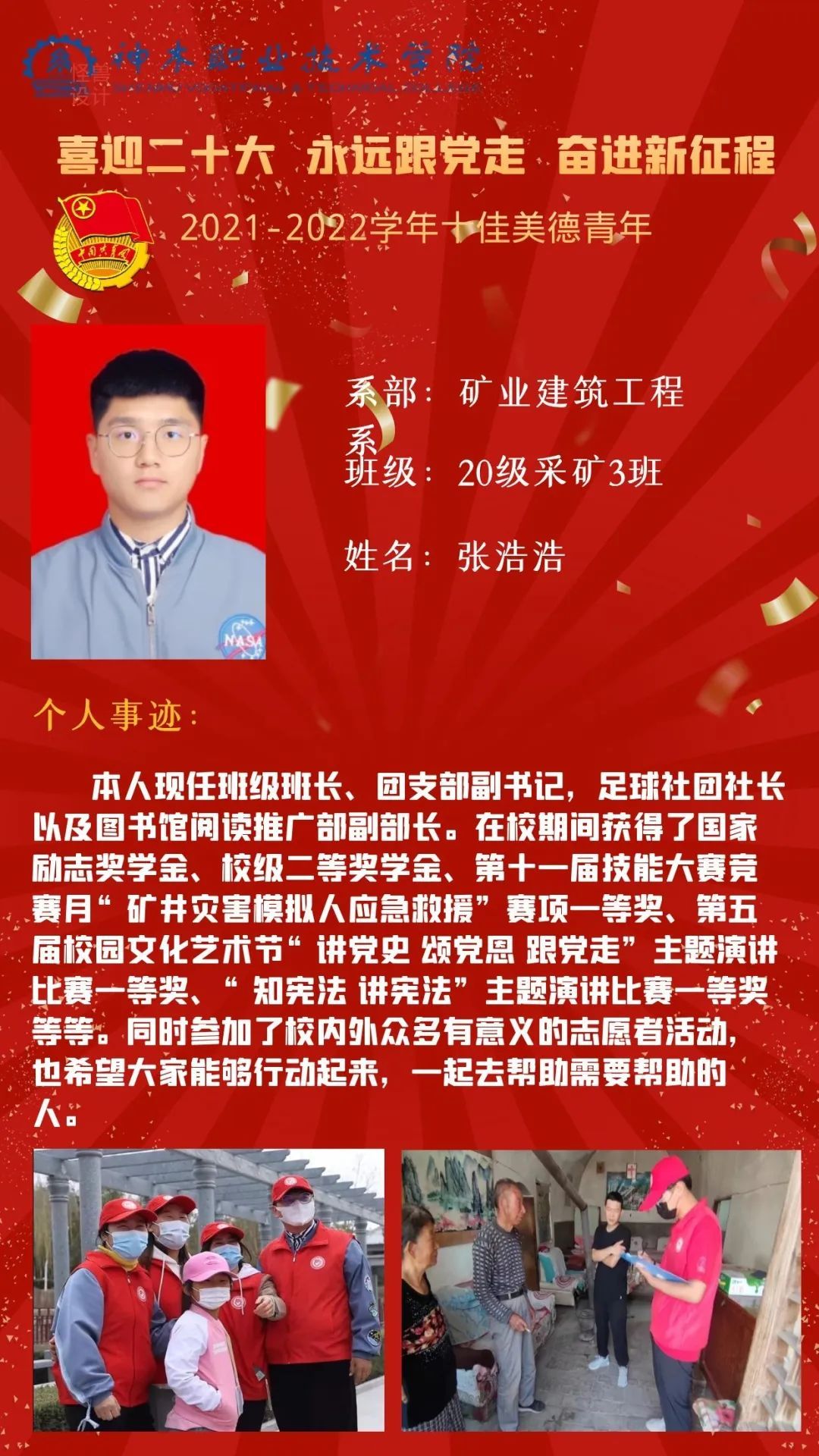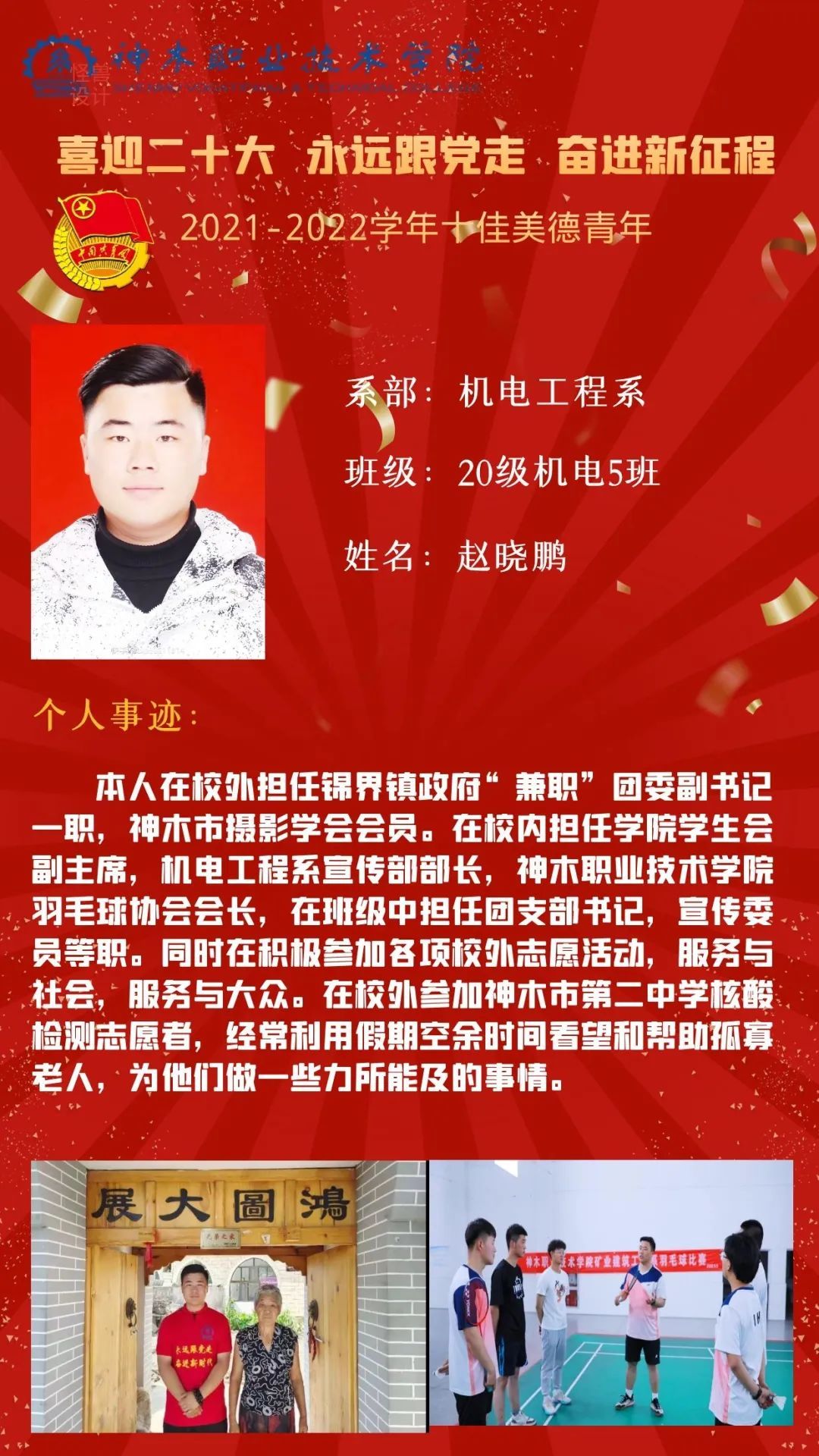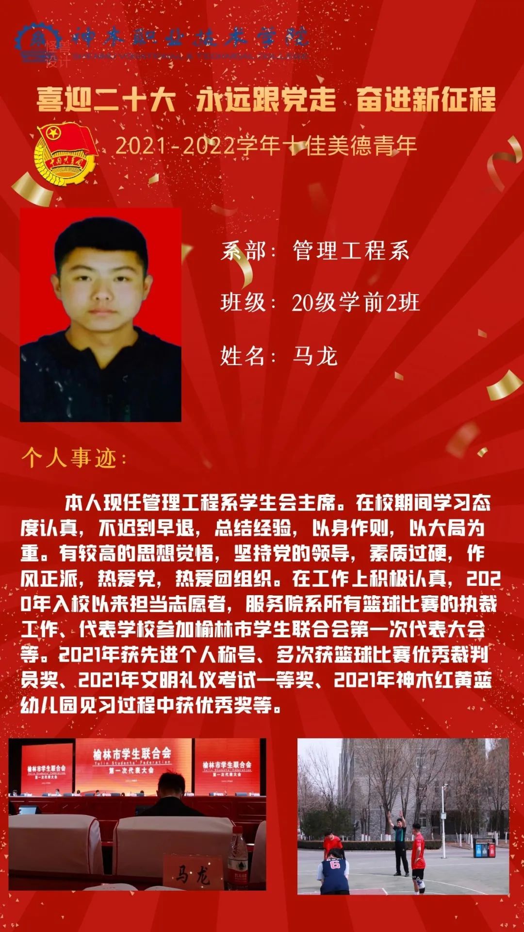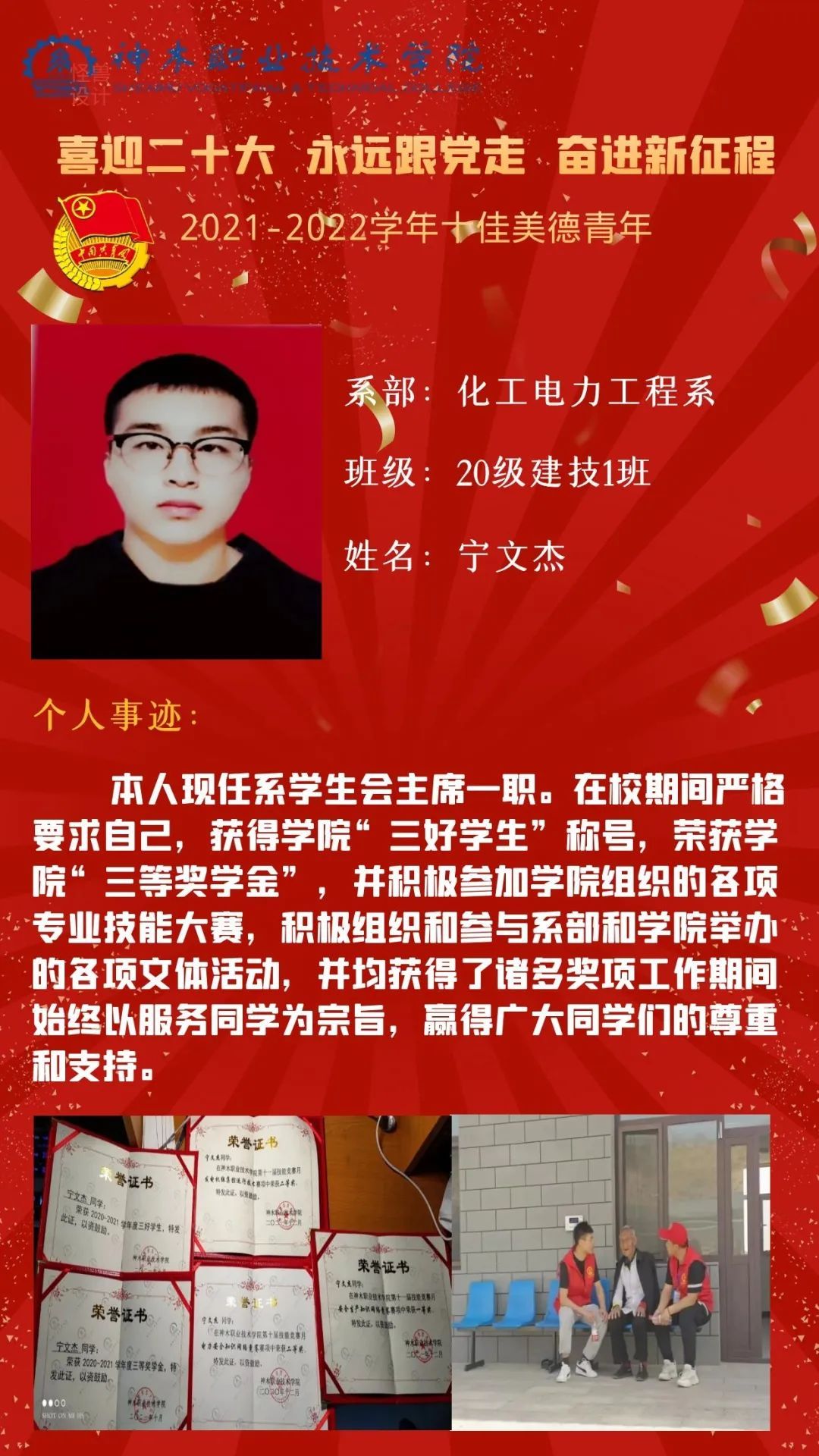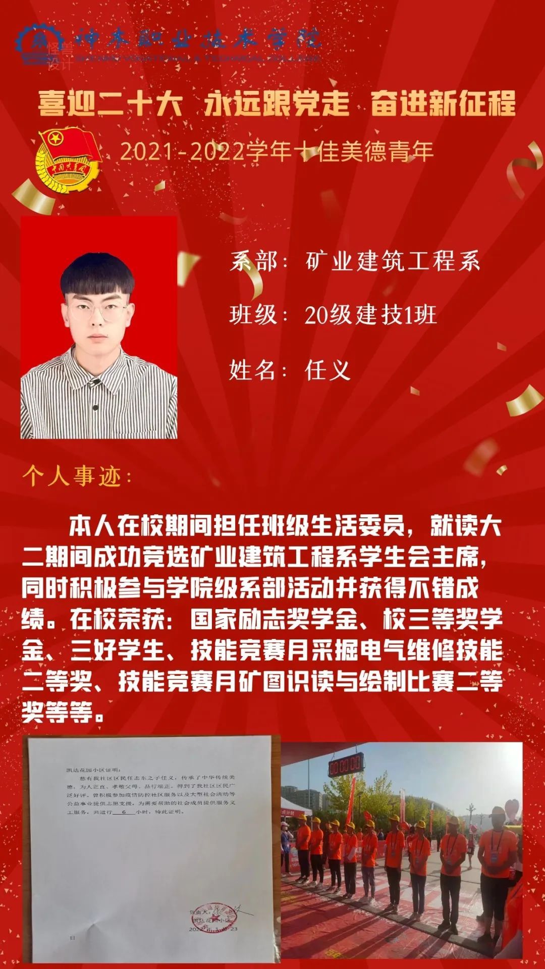 在建团百年之际,为充分发挥青年典型示范引领作用,团结引领团员青年踔厉奋发、砥砺笃行,以优异成绩迎接党的二十大胜利召开,特推出“喜迎二十大 永远跟党走 奋进新征程”神木职院十佳美德青年风采展。