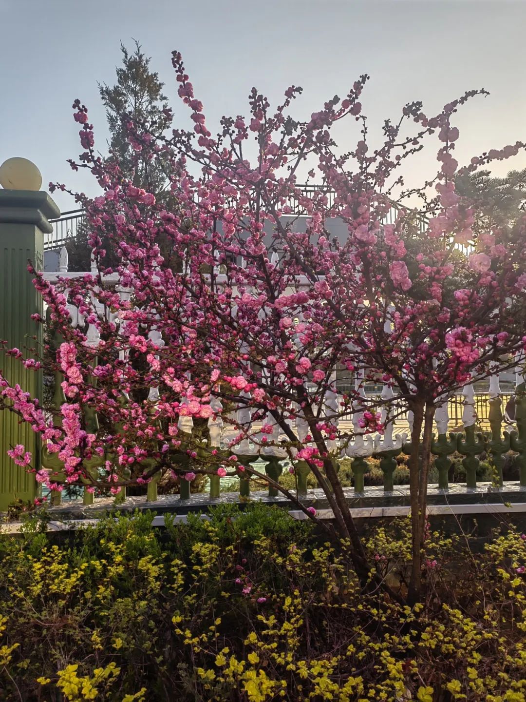 花的枝头上缀满了花蕾,在那交错的枝条下面,长出了嫩绿的野草。