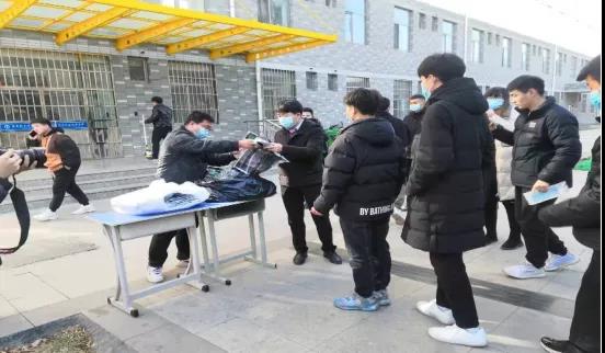中午12:30分在10号公寓楼门口,学生会主席任义同学组织受助学生有序排队领取“保温三件套”,杨浩宇、白林飞、闫云等老师亲切的与学生交谈,了解其家庭状况并鼓励他们好好学习,同学们对这务实的物资和老师殷切的关怀感动不已,有学生表示:柔暖的围巾、务实的耳套、厚实的手套无一不承载着老师们沉甸甸的爱与关怀,这让人觉得这个冬天分外温暖,很庆幸在这里就读。