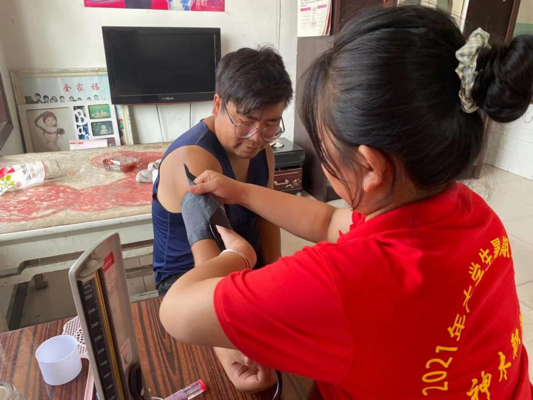 高血压是目前国内外人群中的流行病、常见病,被称为“无声的杀手”,大多数患者可在没有任何症状的情况下发病,并且血管壁长期承受着高于正常压力会导致冠心病、脑卒中等严重疾病。为了更好的帮助沈家塔村名了解自己的身体状况,我们入户为村民测量血压,短短的一天时间,我们一共走访了50多户村民家,与此同时,同学们在量血压的时候,还通过聊天和他们了解他们的身体状况和生活现状,给予村民专业的建议和意见。