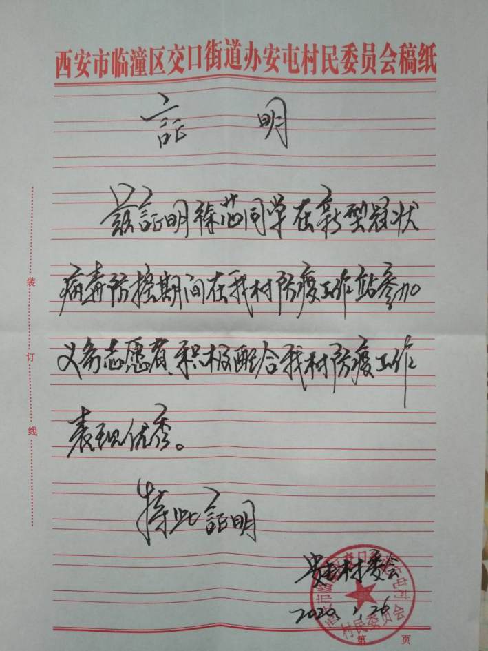 这个特殊的寒假,徐芯同学先是自愿到村上当志愿者,为大家宣传防疫知识。随着疫情严重加剧、各省纷纷下发《重大突发公共卫生事件一级响应》,徐芯同学响应西安市临潼区交口街办安屯村村委会发出的志愿者号召,以共青团员的身份参与到队上15人的志愿者团队,负责每天晚上值班巡逻等工作。不仅出力,他还在周围的超市、医院等地买了180个口罩并带头捐款100元。捐款虽然不多,但徐芯同学说这是一名共青团应尽的职责。