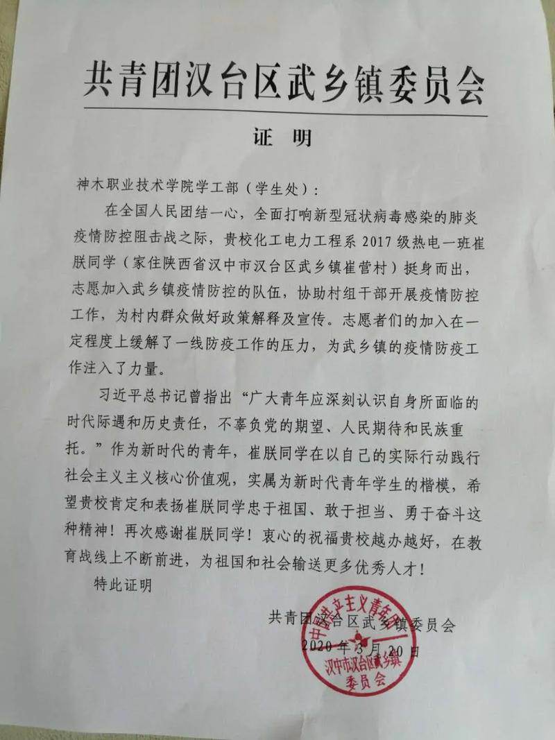 新冠肺炎疫情汹涌来袭,在这一特殊的艰难时刻,无数志愿者以实际行动传递温暖奉献爱心我院化工电力工程系2017级热电1班的崔朕同学(家住陕西省汉中市汉台区武乡镇崔营村)也在第一时间自愿加入了家乡的疫情防控协助队伍,为村内群众做好政策解释及宣传工作。