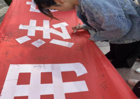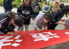 5月12日早晨在三号教学楼下拉开横幅,全校学生在横幅上签名,继续践行法制教育的重要性。