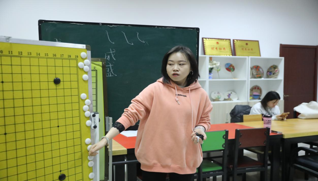 棋弈社举办的一场精彩棋艺活动。棋手们分坐两旁,一场无声的较量正在展开。成员们时而托腮沉思,时而果断落子,表情随着棋局的变化而变幻。