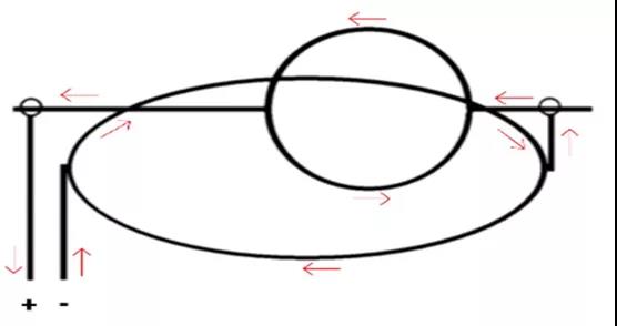 上图显示了电子在线圈中流动的方向:从电池的负极开始,流经激磁线圈,然后到了右边的支架。从这里开始,电子流入电枢线圈,接着流入左边的支架,最后到了电池的正极。