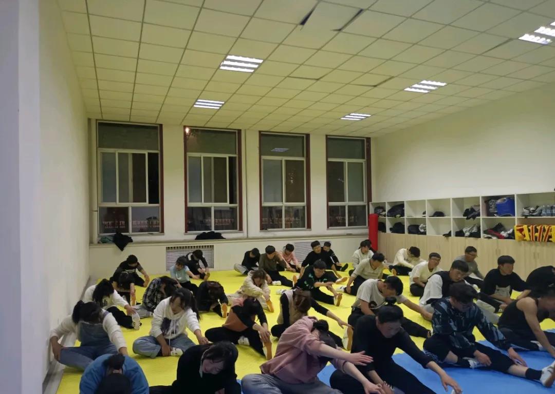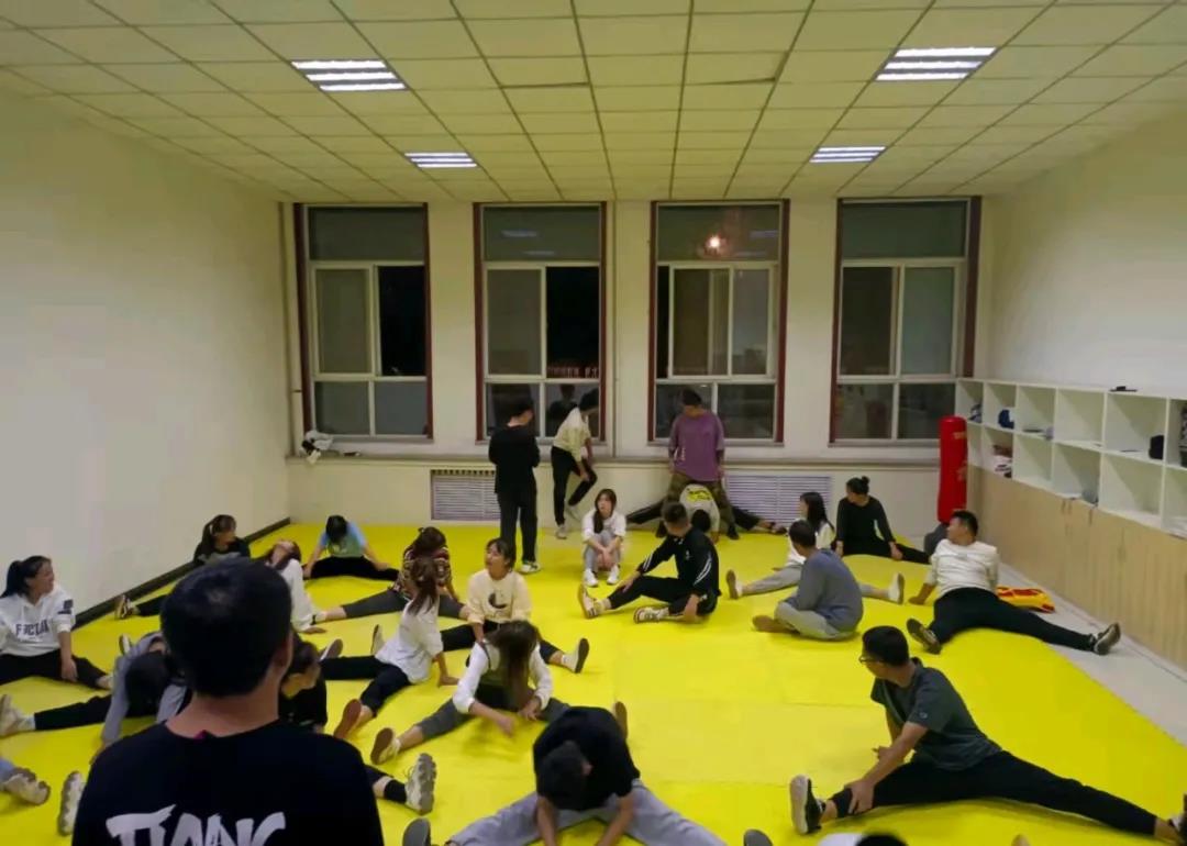 开始活动时由两位教练带领40多位社员在训练室进行了一些简单基础的拉伸练习,经过前期的军训时光,大家明显体力和韧劲都比之前好了一些,再加上两位教练耐心教导,训练井井有条。