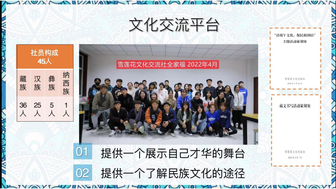 社团自2022年4月建立以来, 受到越来越多同学们的关注。雪莲花文化交流社从刚开始的46人,发展到现在的78人,我们的大家庭也逐渐壮大起来。在指导老师和社团管理人员的共同努力下,每周一次的社团活动如期展开、也获得了团委的认可;和我们一起弘扬民族文化,为自己的家乡代言;