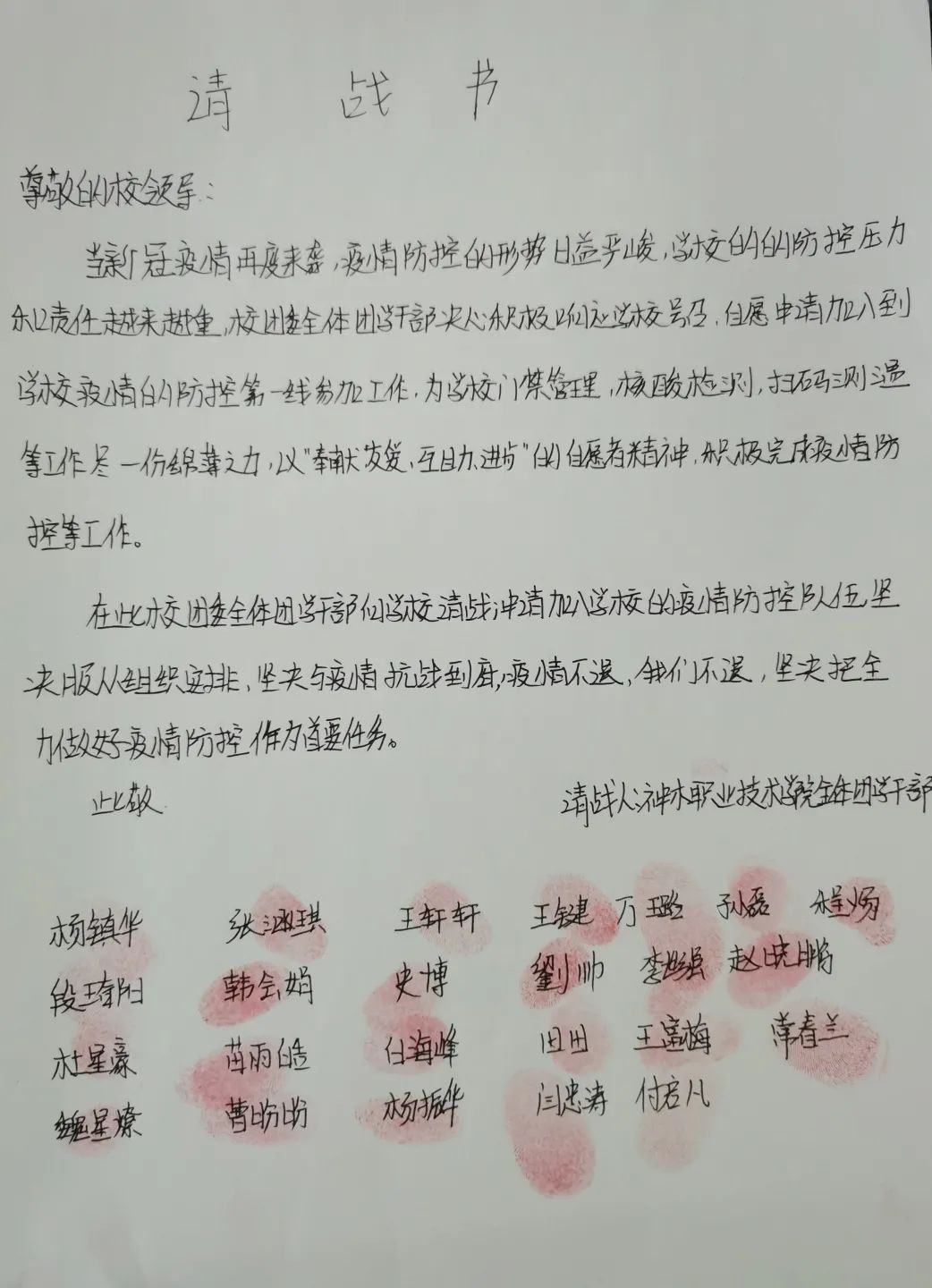 为进一步配合学校做好校园疫情防控工作,我校团委组织开展“疫’起行动,青春有我”志愿服务活动。志愿者们也毅然地签下了请战书,用自己的切身行动展示着“‘疫’起行动 青春有我”的抗疫精神,让更多的同学们一起加入到疫情防控志愿者团队中。