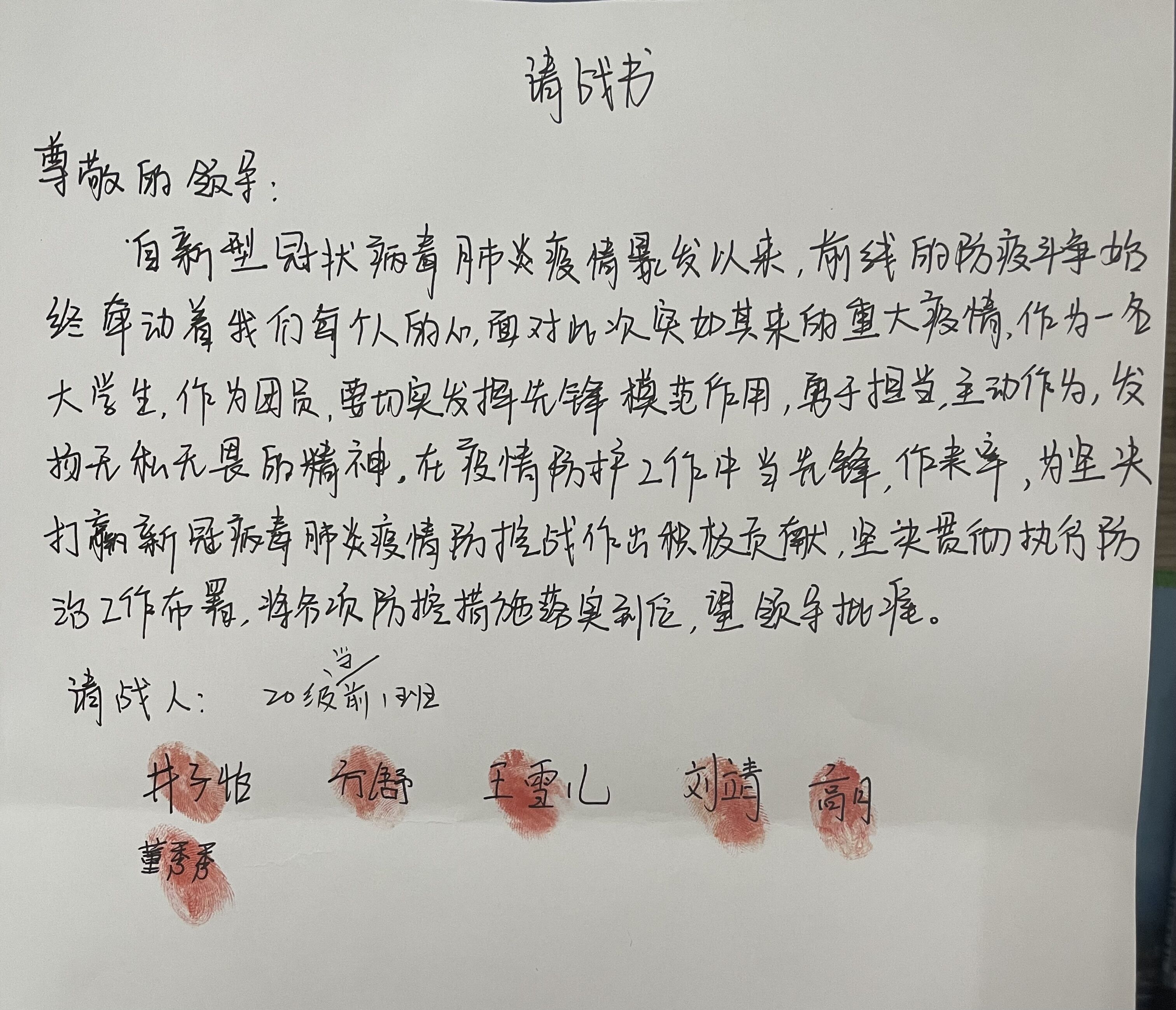 12月31日,我院20级学前1班的六名学生,表达了他们请求服务一线的决心。“身为团员,虽不是医护人员,但愿意发挥先锋模范作用,勇于担当,主动作为,发扬无私无畏的精神”。