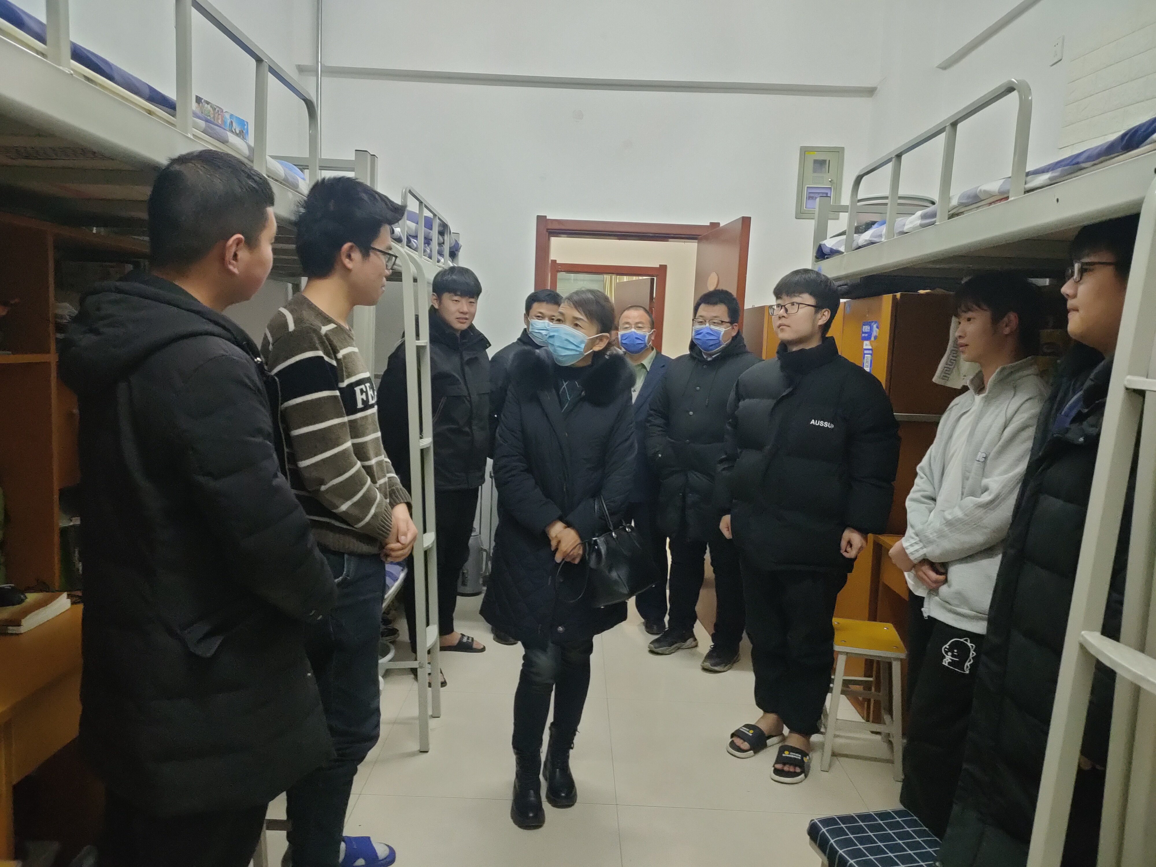 正值元旦佳节,因疫情影响,很多学生不能回家过节。为了体现学校人文关怀,郭亚芳副校长带队,学生处、各系分管学生的领导、学工科负责人、全体辅导员在2021年12月31日晚上到学生公寓楼关心关爱学生。郭校长走进学生宿舍嘘寒问暖,了解同学们的学习、生活情况。