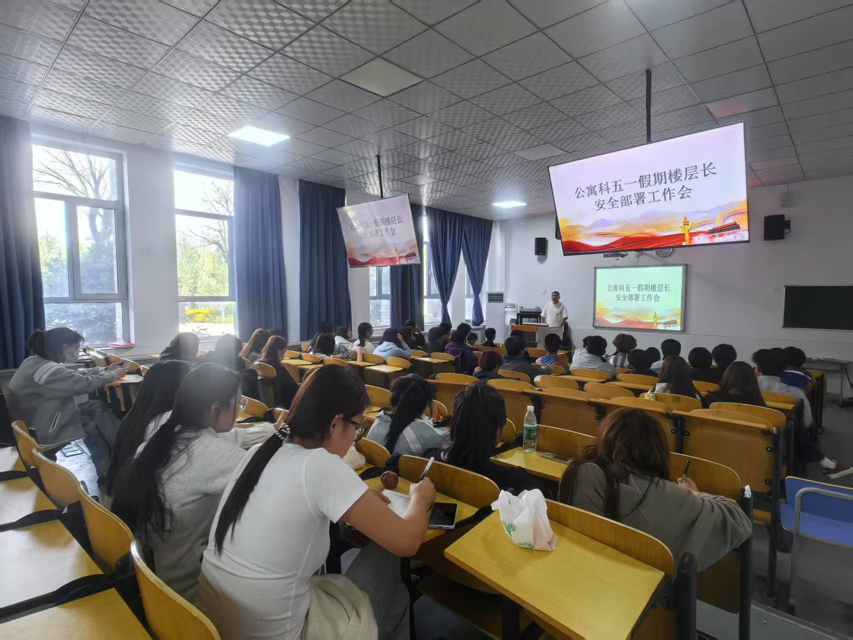中午十二点在3号教学楼召开公寓科五一假期楼层长安全部署工作会,公寓科崔晓宇老师以及各楼楼长层长参加会议。崔老师首先向楼层长传达五一假期公寓安全管理的重要性和具体要求 明确各楼层长在假期期间的安全管理职责,确保责任落实到人,同时协助辅导员完成晚查寝的工作。