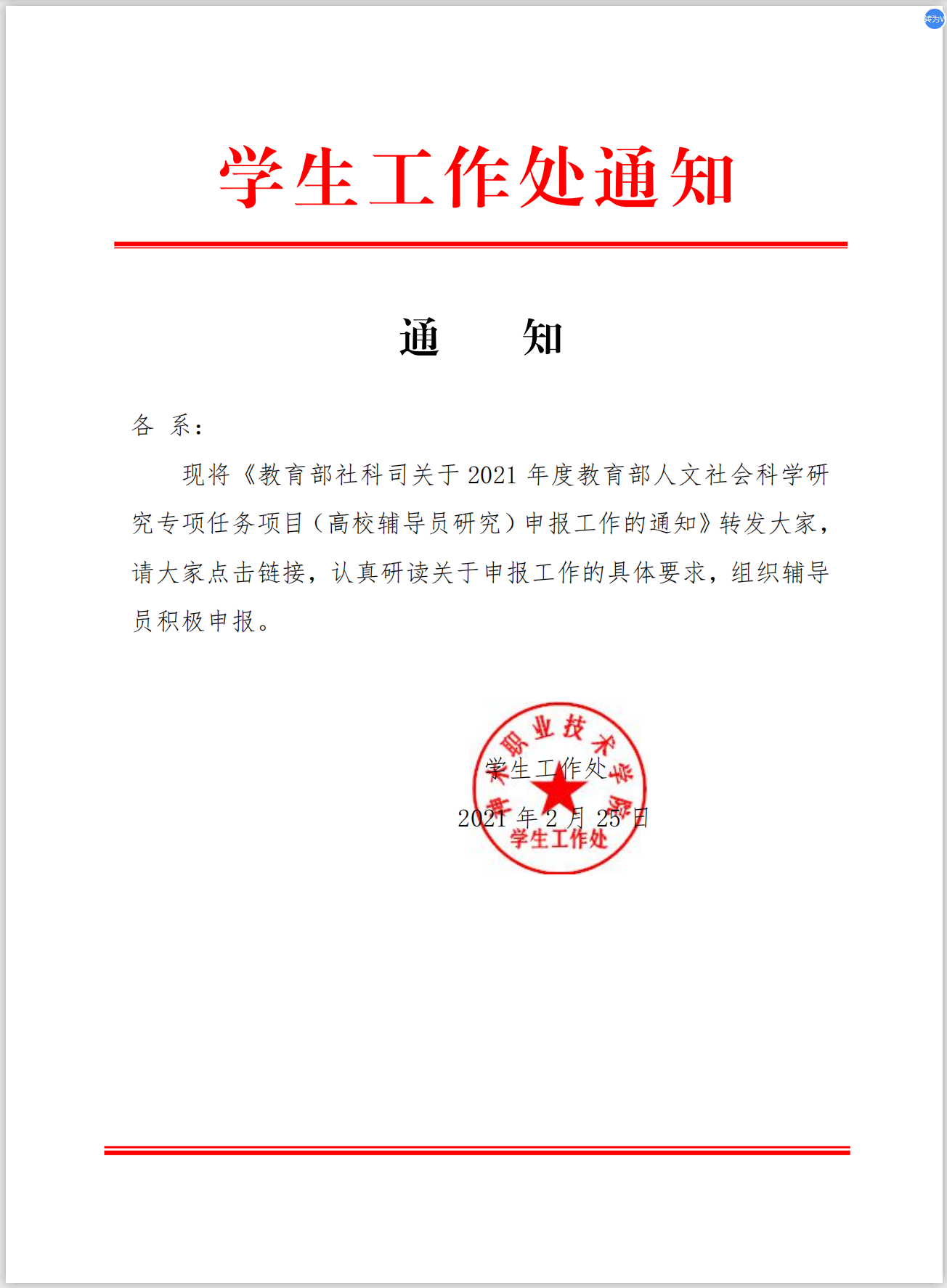 关于2021年度教育部人文社会科学研究专项任务项目(高校辅导员研究)申报工作的通知