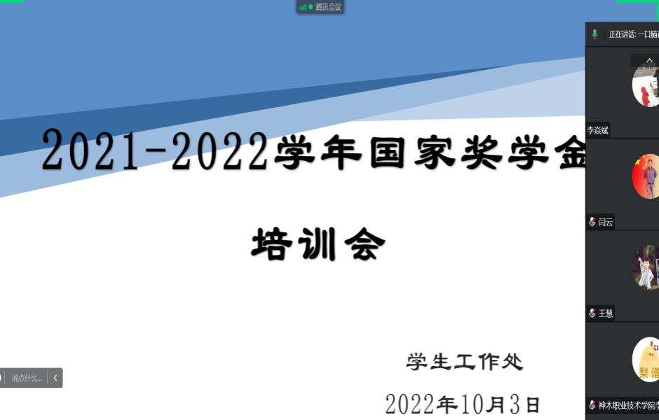为全面贯彻落实国家奖学金评审相关文件精神,进一步推动我校2021-2022学年国家奖学金评审工作的有序开展,确保评审工作更规范、更科学。10月3日下午15:30,学生工作处举办了2021-2022学年国家奖学金评审资料填报线上培训会议。学生工作处处长代创伟、副处长胡巍巍、各系分管主任、学工科科长、相关辅导员参加了本次线上会议,会议由学生工作处姜慧敏老师主持。