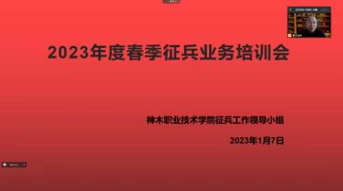 代创伟主任讲话指出,我校2022年征兵工作任务超额完成,成绩位列榆林市高校第一,受到各级领导肯定和表扬,榆林市委市政府授予我校2022年度全市征兵工作先进单位,学校在去年12月份召开的榆林市征兵工作会议上作了经验交流。代创伟主任强调,高质量完成征兵任务,向部队输送优质兵源,是高校义不容辞的义务和责任,是必须保质保量按时完成的政治任务,各系部要切实提高政治站位,引起高度重视,立即开展宣传动员,鼓励我校适龄青年踊跃报名参军入伍。代创伟主任要求各系部要认真领会本次会议精神,对春季征兵工作进行再安排再部署,利用班级微信群等媒介,广泛宣传中省市及我校各项征兵优待政策,帮助、指导意向参军学生尽快完成应征报名,认真做好征兵各环节、各流程跟踪服务,确保我校2023年度春季征兵任务圆满完成。