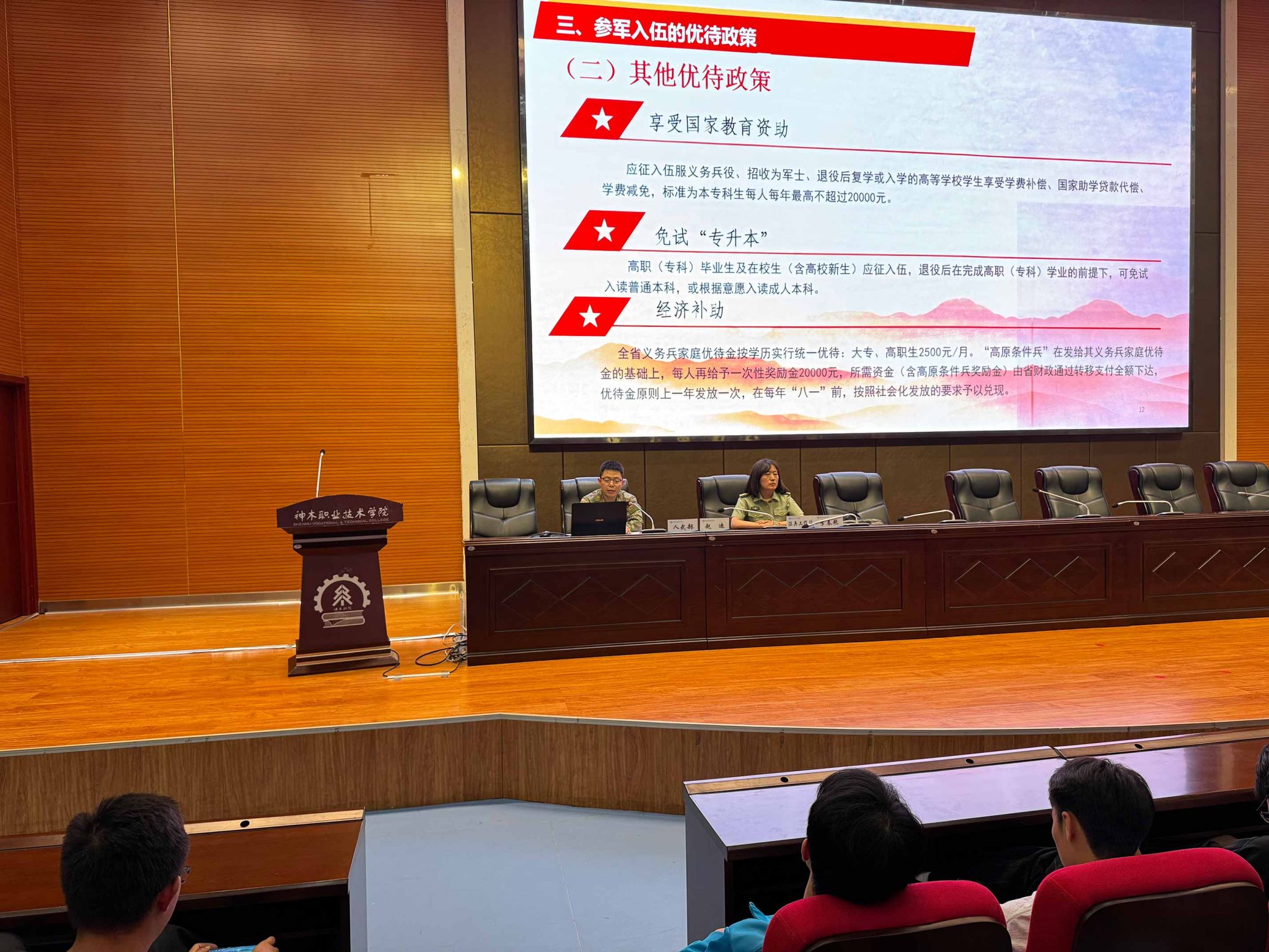 赵迪同志围绕入伍条件、参军优待政策、退役服务保障等方面,系统全面的解读了中央、陕西省、榆林市和神木市的各项征兵政策,让在场学生掌握了国家当前的各项征兵政策,提前做好了踊跃参军、报效祖国的思想准备。
