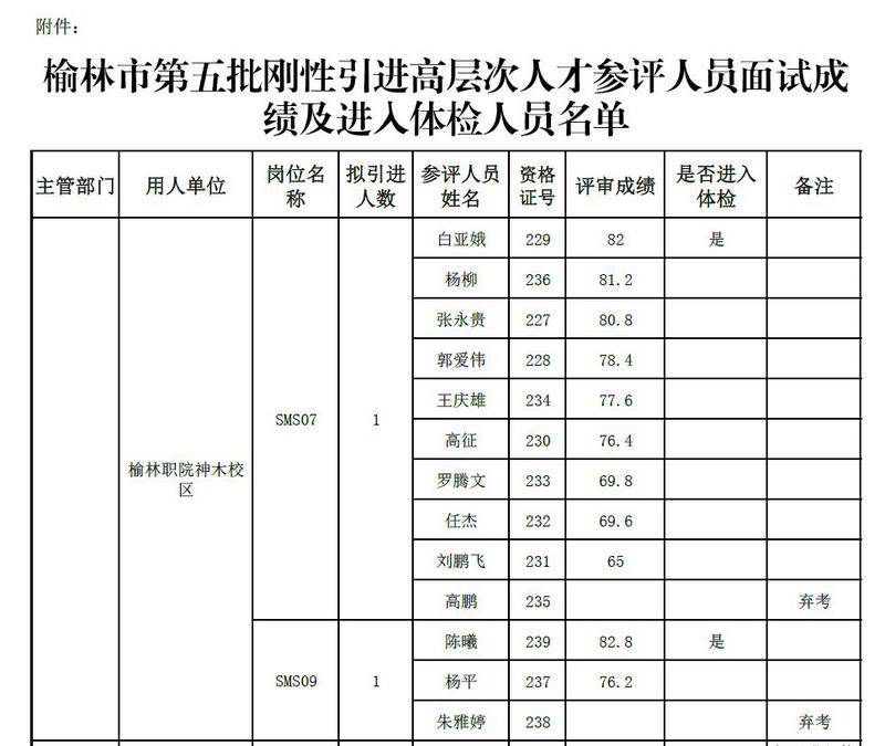 榆林市第五批刚性引进高层次人才面试评审成绩、进入体检人员名单及体检工作安排公告 按照《榆林市第五批刚性引进高层次人才公告》及《榆林市第五批刚性引进高层次人才面试评审公告》要求,经榆林市紧缺人才引进培养工作领导小组会议研究,确定以下94名人员为进入体检对象(见附件),现将面试评审成绩...