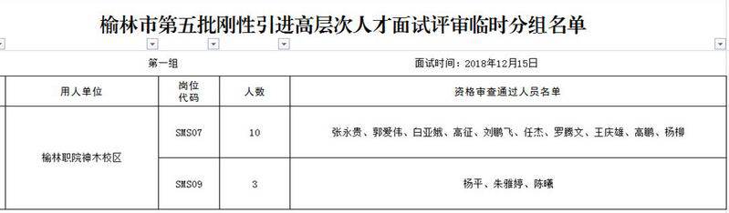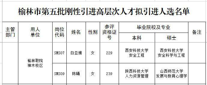 榆林市第五批刚性引进高层次人才人选公示 按照《榆林市第五批刚性引进高层次人才公告》安排,经组织申报、资格审查、面试评审、体检、考察、会议研究审定等程序,拟确定以下88人为榆林市第五批刚性引进高层次人才人选(具体名单附后)。现予以公示,欢迎社会...