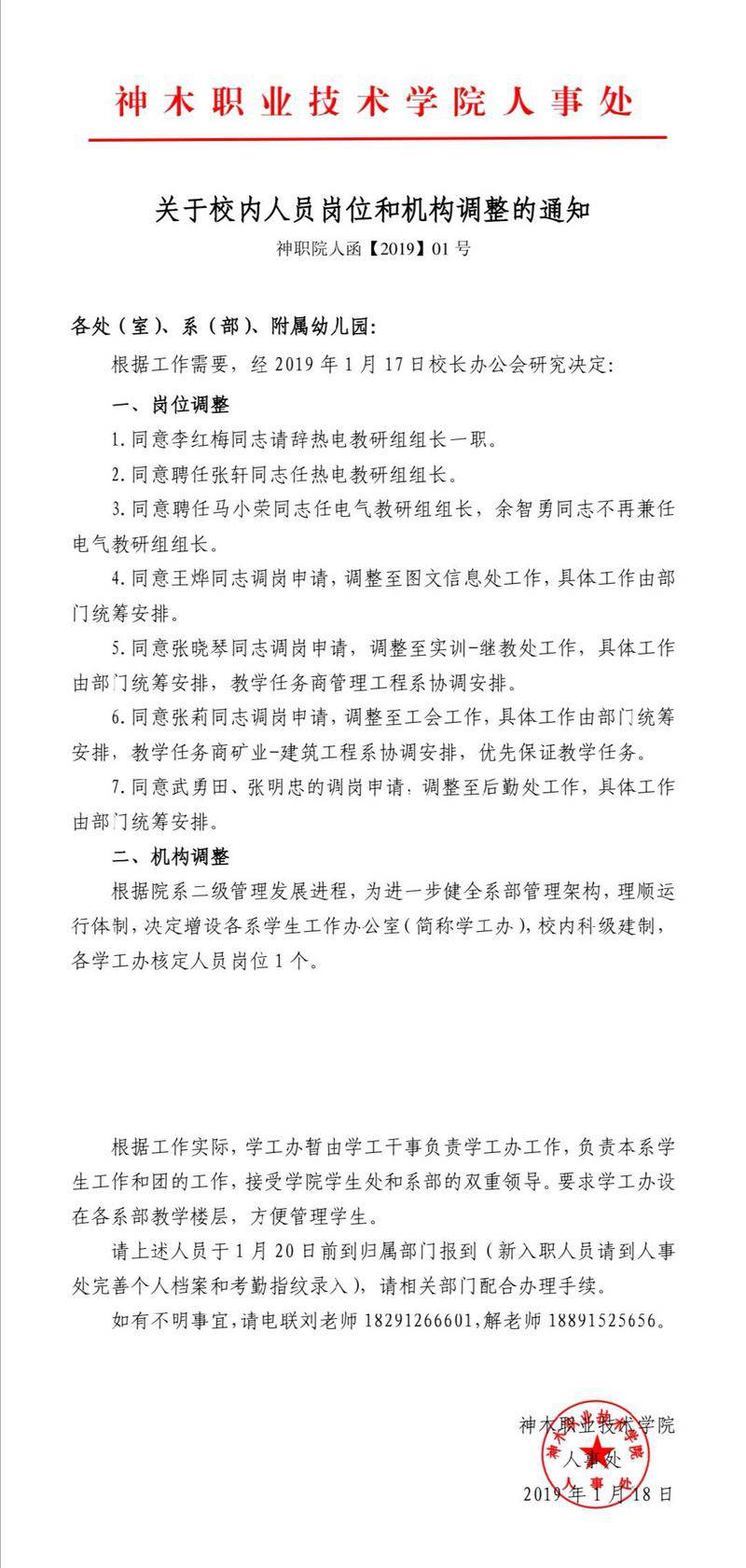关于校内人员岗位和机构调整的通知 关于校内人员岗位和机构调整的通知
